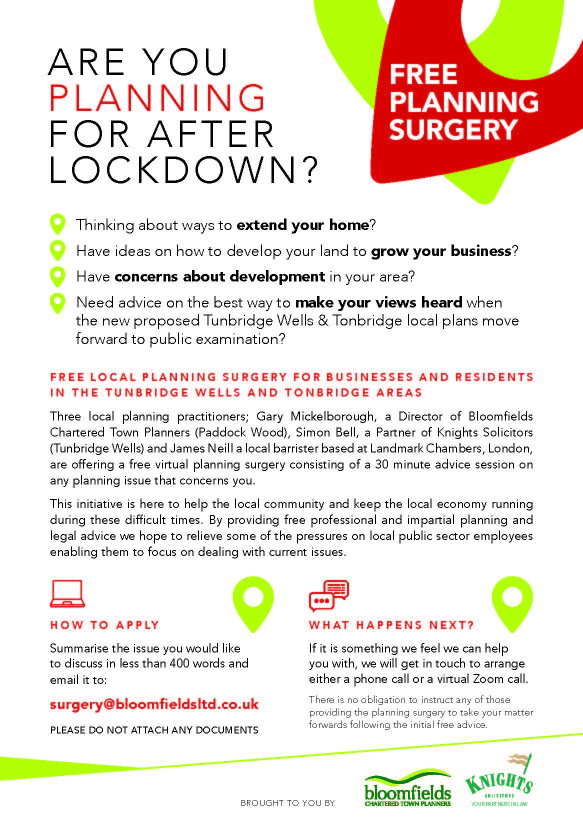 Knights have teamed up with Bloomfields and James Neil (Landmark Chambers) to offer a free of charge 30 minute surgery to answer all of your planning queries.